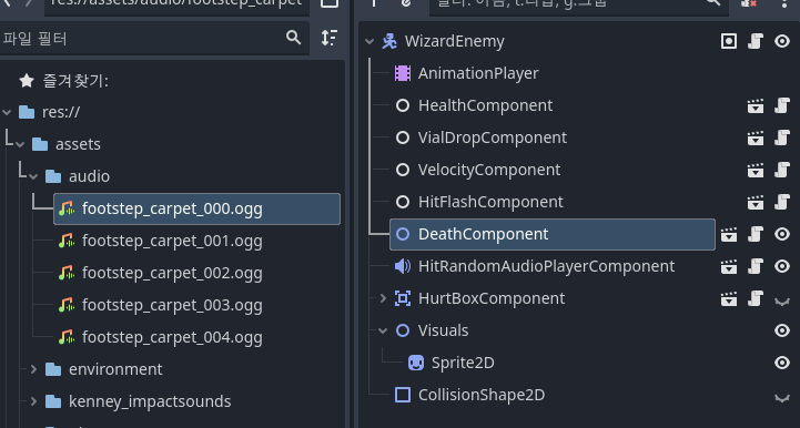 그러니 deathcomponent의 on_died에도 오디오플레이어를 연결해 play_random()을 한번 더 넣어줘야 한다.