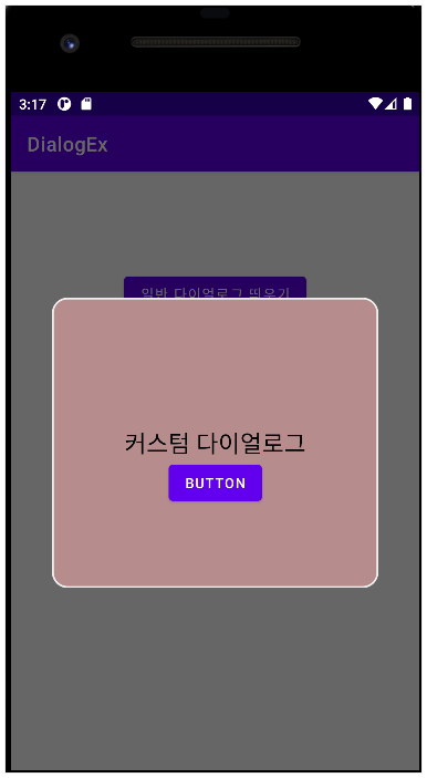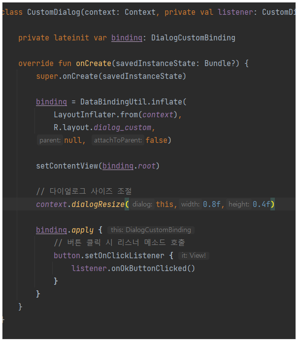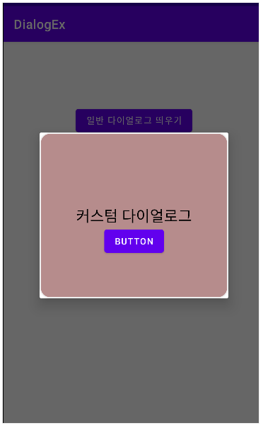 커스텀 다이얼로그를 띄우기 위해서는 원하는 모양의 xml 레이아웃과 Dialog 코드 작성이 필요하다.