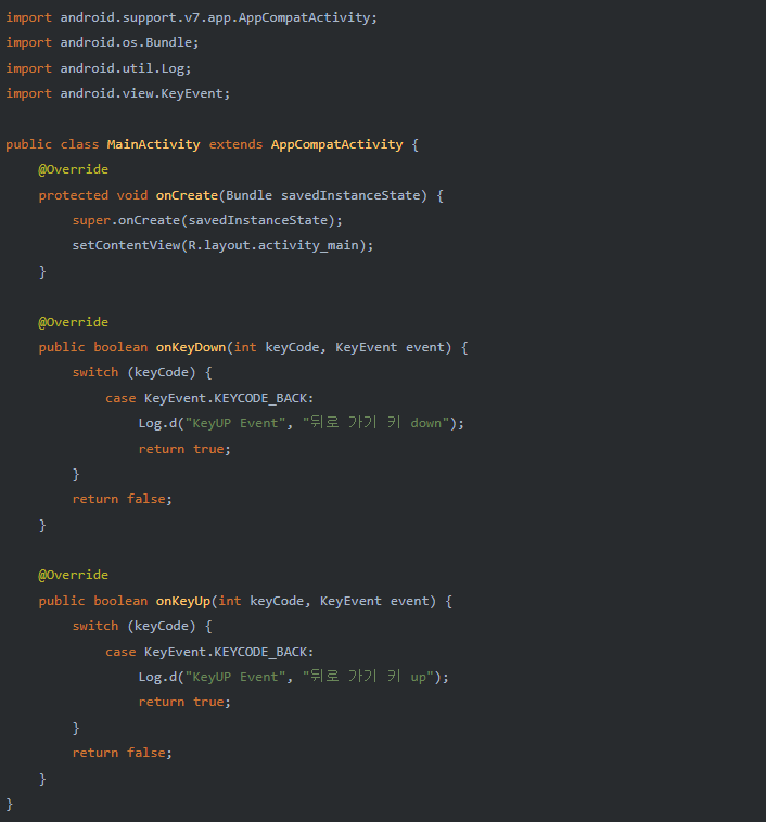 onKeyDown() 함수와 onKeyUp() 함수를 재정의한다. KeyCode 값이 KeyEvent.KEYCODE_BACK일 경우 로그 캣에 로그를 남기도록 하고 true를 리턴했다. 뒤로 가기 키를 제외한 나머지 키 이벤트에 대한 처리는 시스템에 맡기도록 하기 위해 false를 리턴하게 한다.