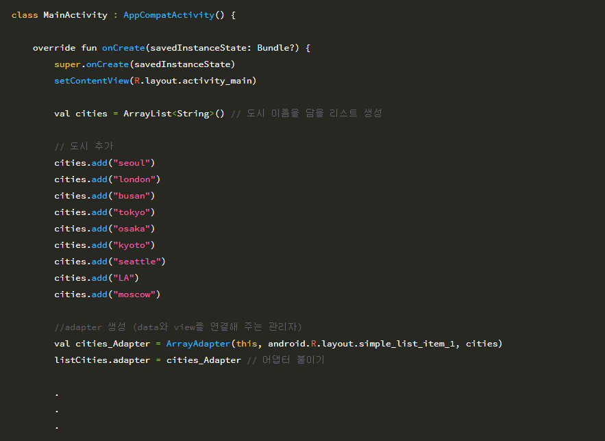 ③ 마지막으로 생성하신 어댑터를 리스트뷰에 연결해 주면 된다.