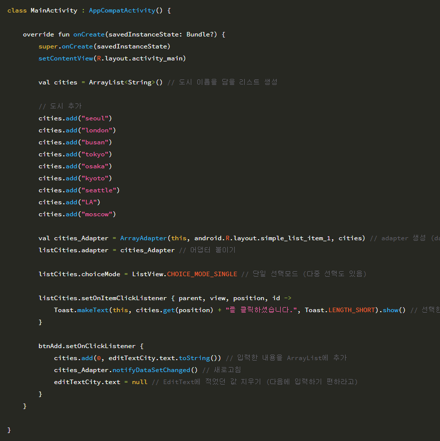 그리고 버튼에 리스너를 붙이듯이 리스트뷰에도 setOnItemClickListener라는 리스너를 붙이면 된다.