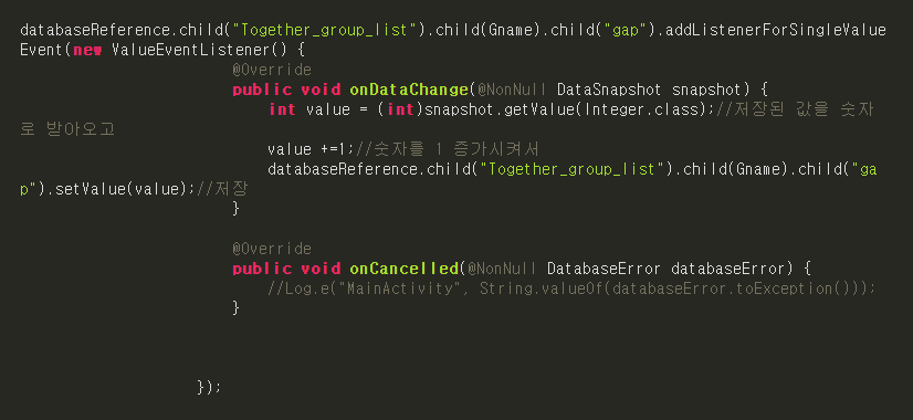 파이어베이스는 json형태로 저장되기 때문에 int로 값을 저장했어도 받아올때는 int로 형변환을 해줘야한다.