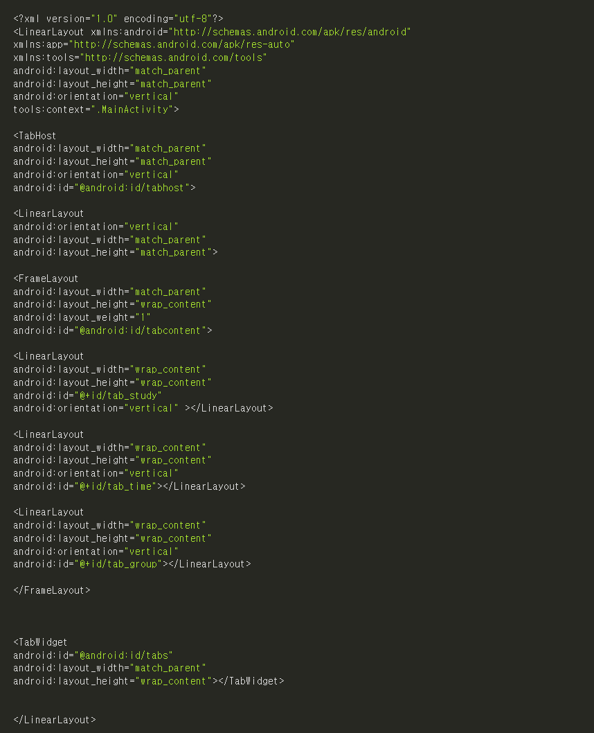 만약 탭 버튼들이 하단이 아니라 상단에 위치하는것을 원한다면 탭위젯을 프레임레이아웃 바로 위로 올려주면 된다.