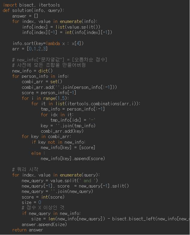 지원자가 지원서에 입력한 4가지의 정보와 획득한 코딩 테스트 점수를 하나의 문자열로 구성한 값의 배열 info, 개발팀이 궁금해하는 문의 조건이 문자열 형태로 담긴 배열 query가 매개변수로 주어질 때,