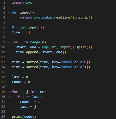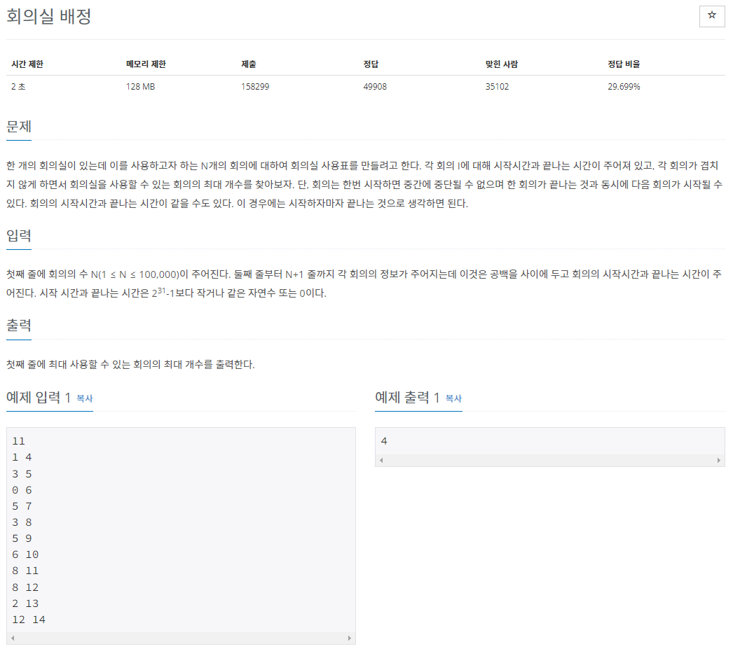 그러면 시작시간으로 오름차순 정렬을 해주고 그거에 다시 끝나는 시간으로 오름차순 정렬을 해준다. (끝나는 시간이 더 중요하기 때문이다.)
